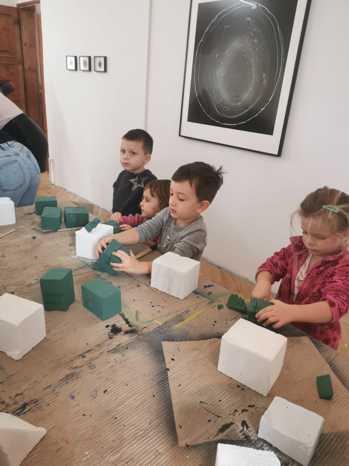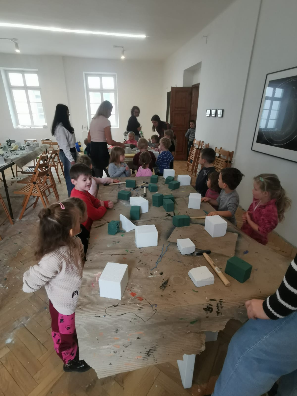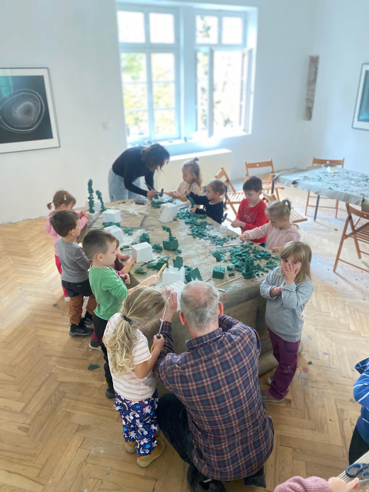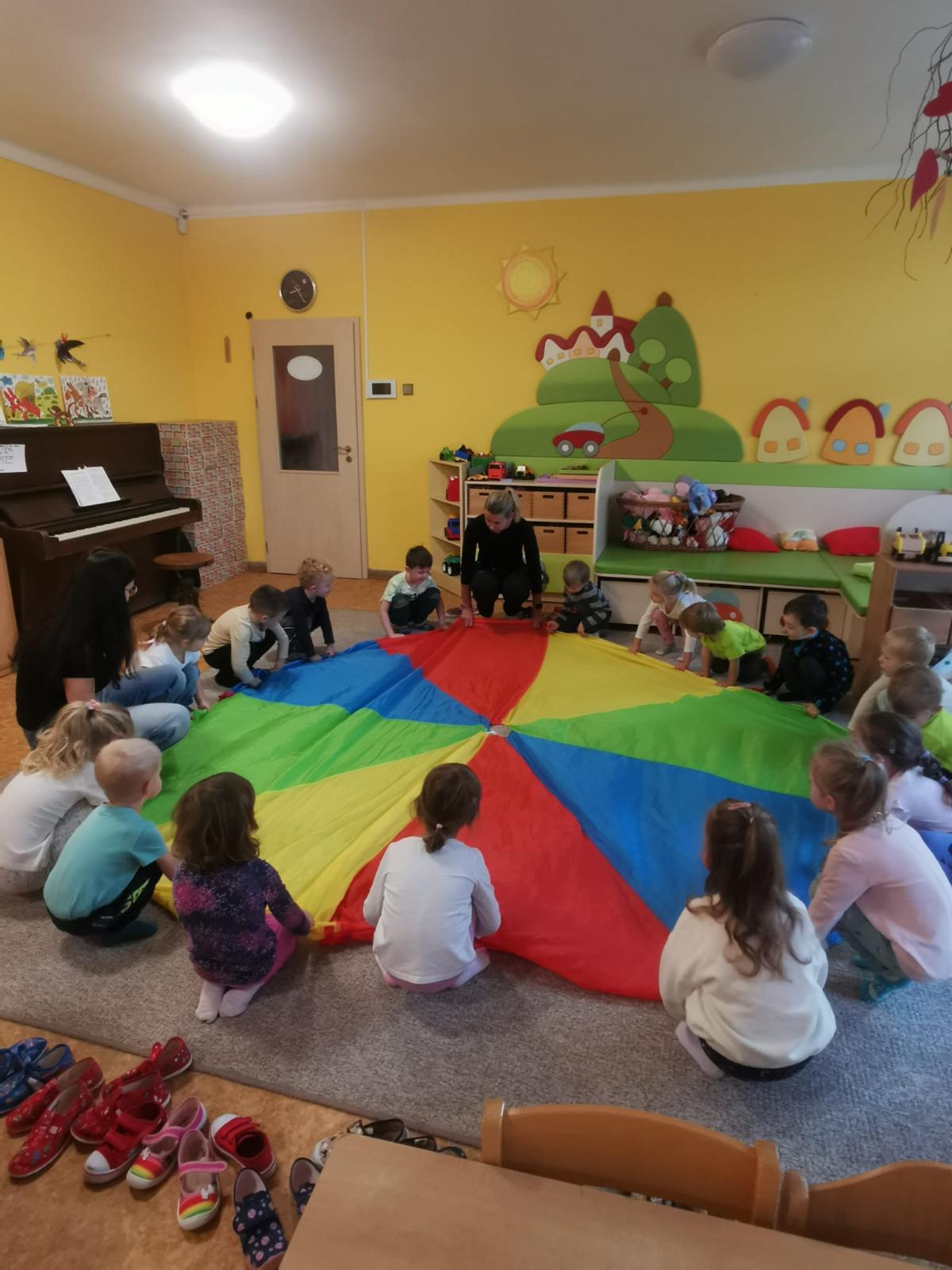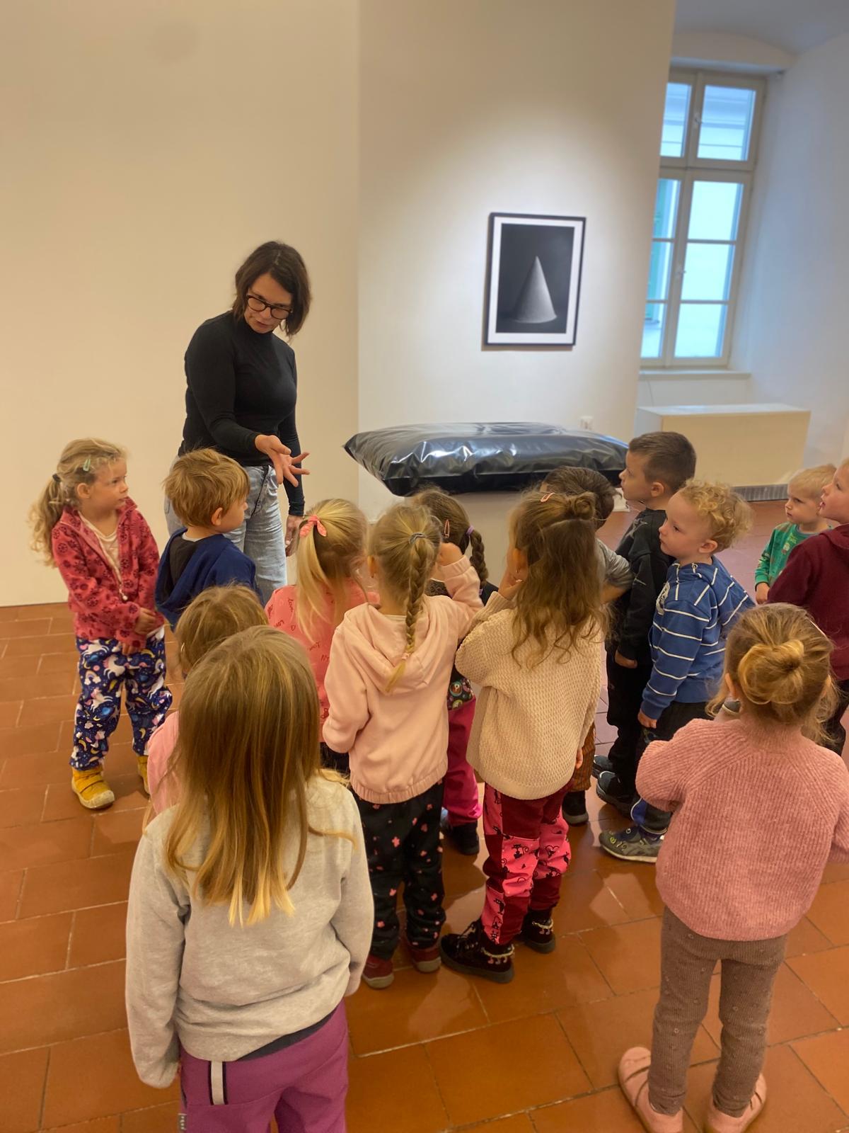 Lokomoční cviky, s padákem “ vítr”, a návštěva galerie. Výstava a sochařské tvoření.