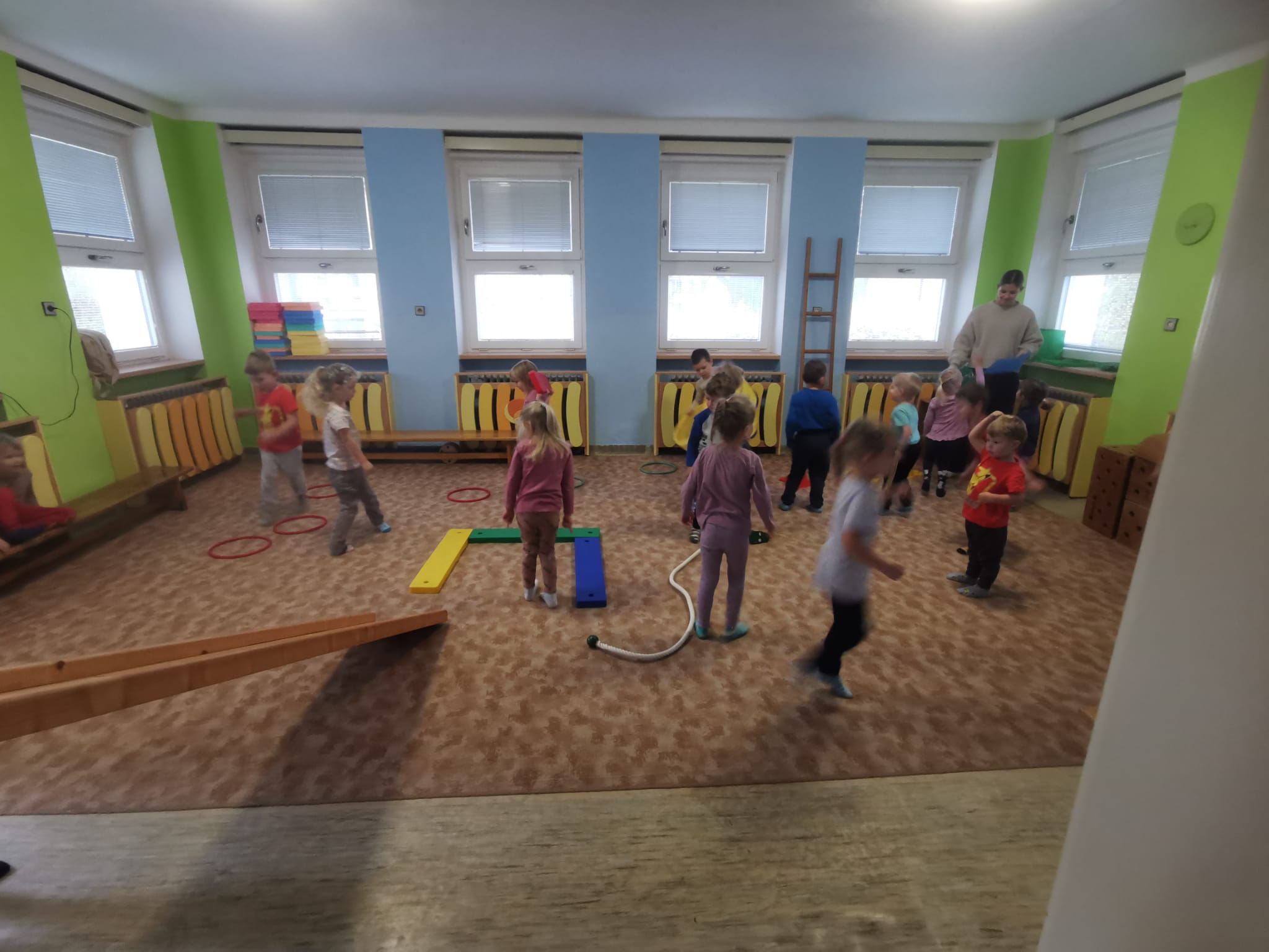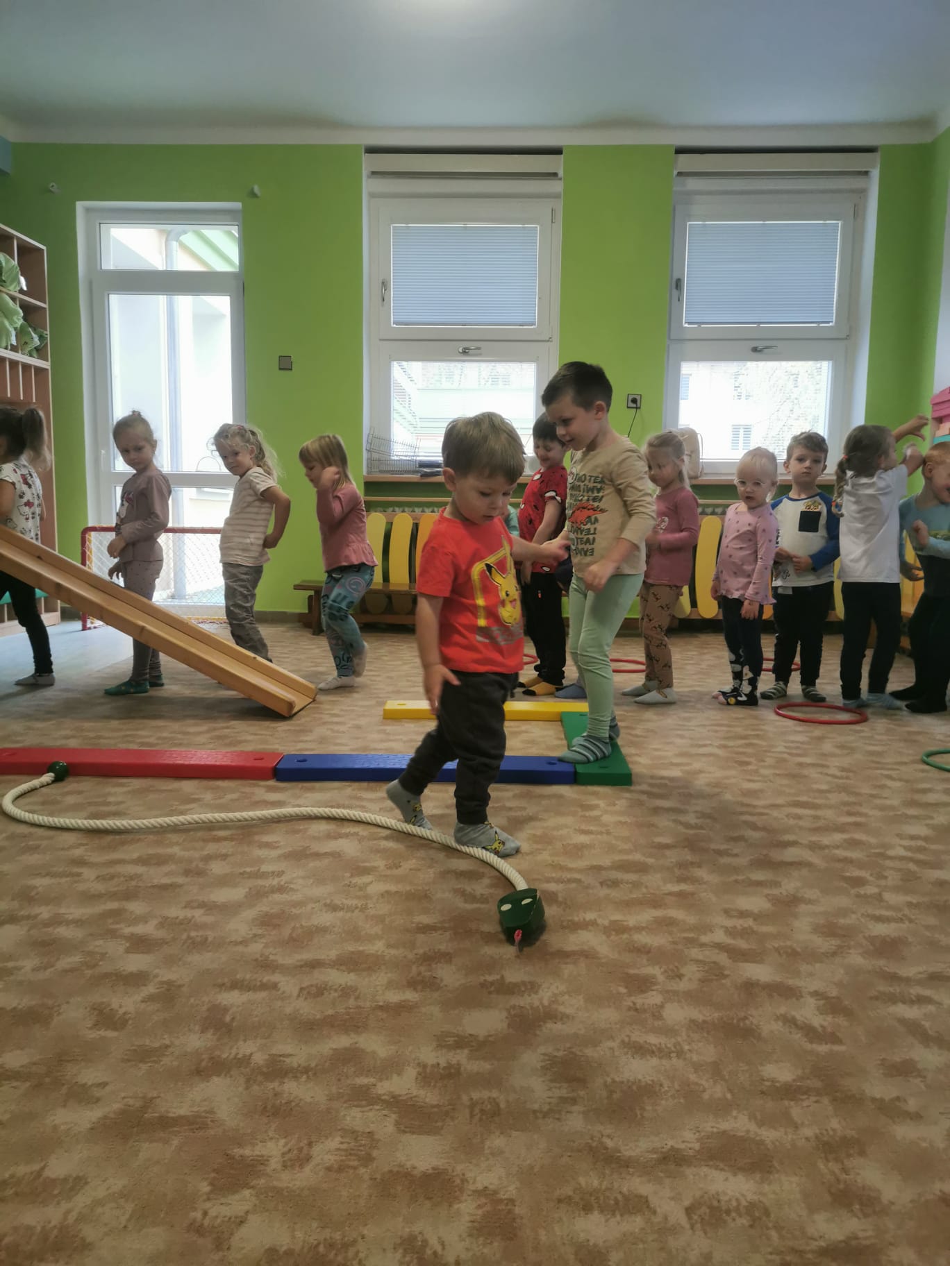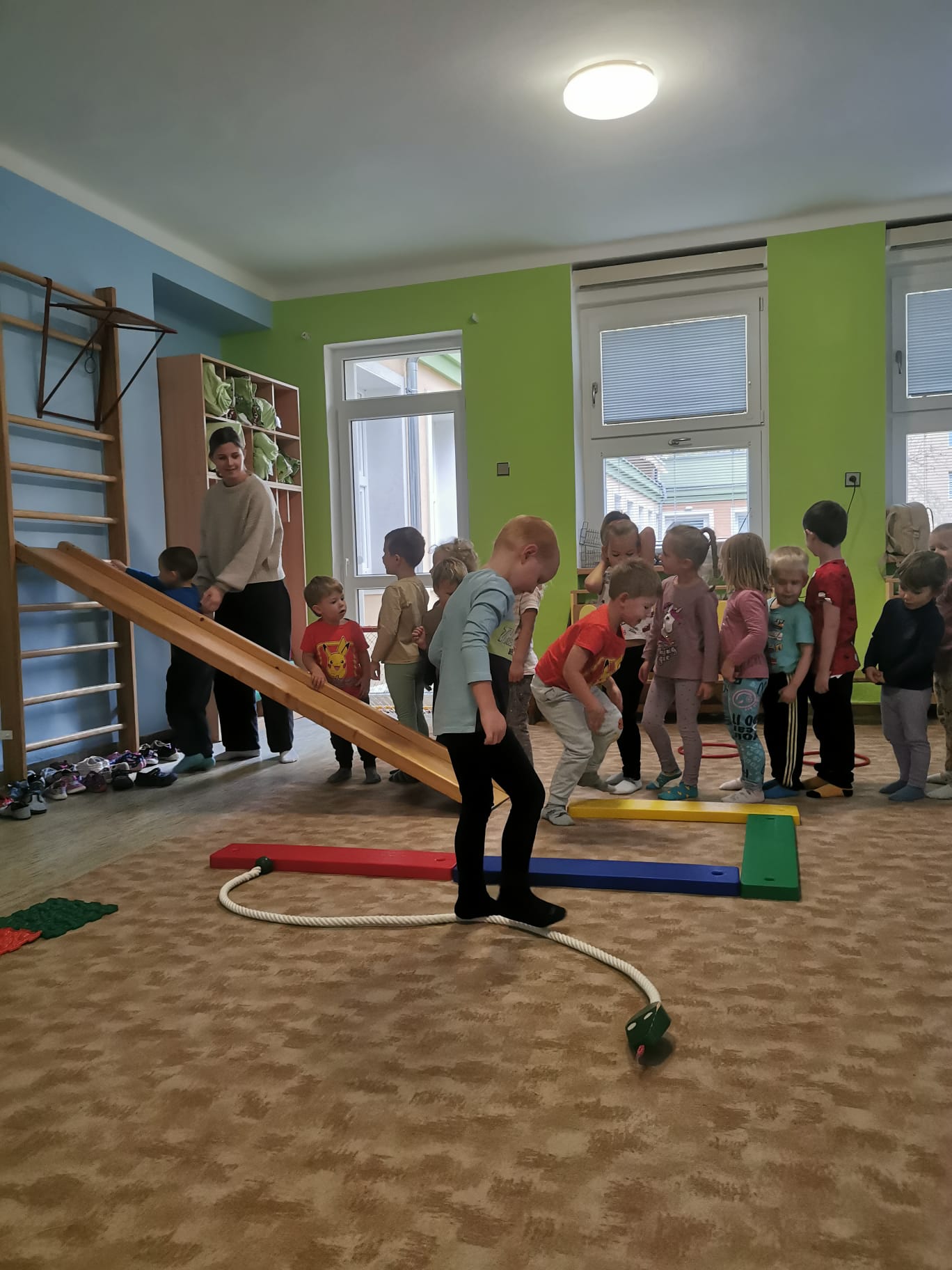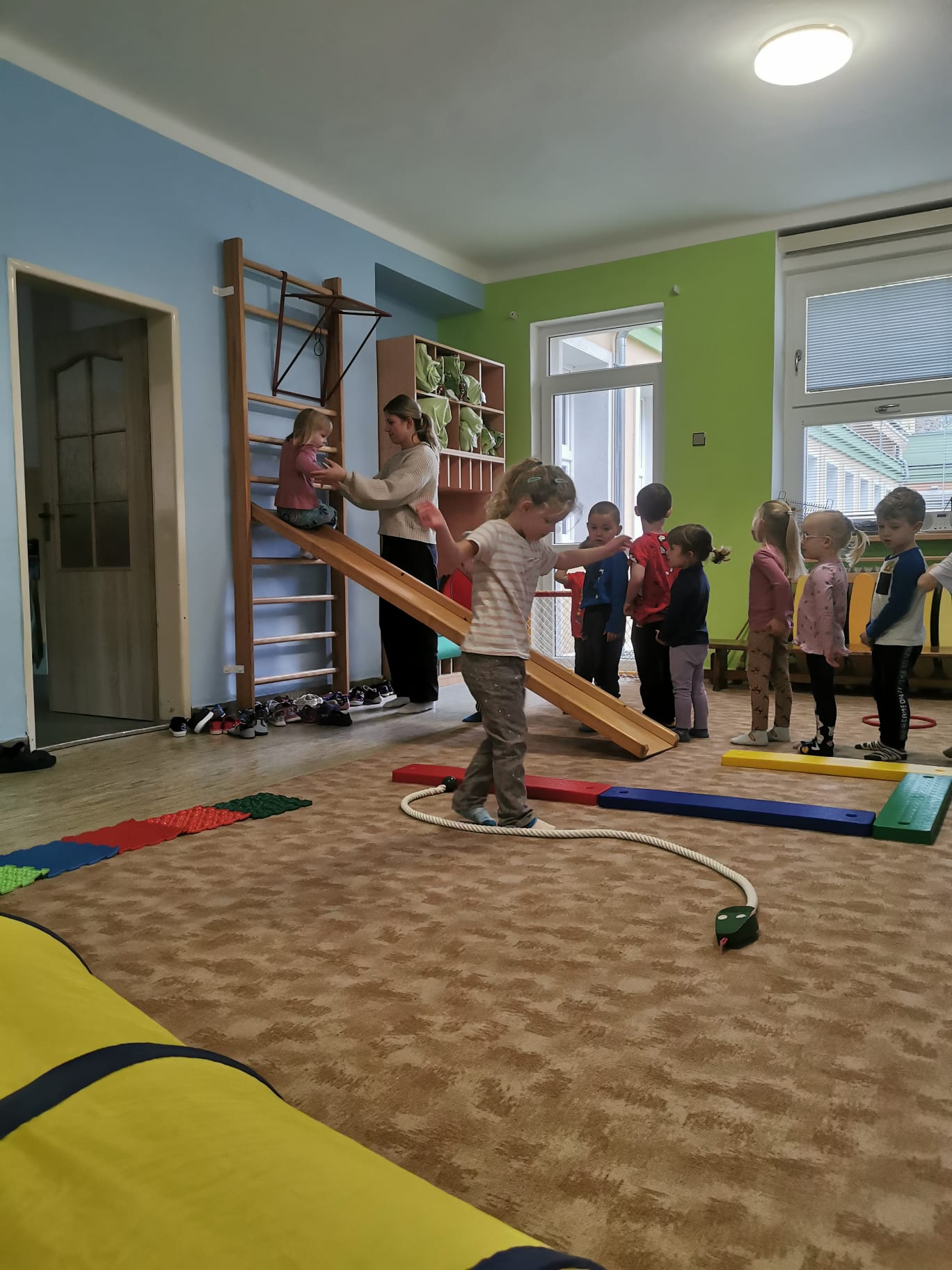 Cvičení- překážková dráha, chůze po laně a po destičkách, prolézání tunelem.