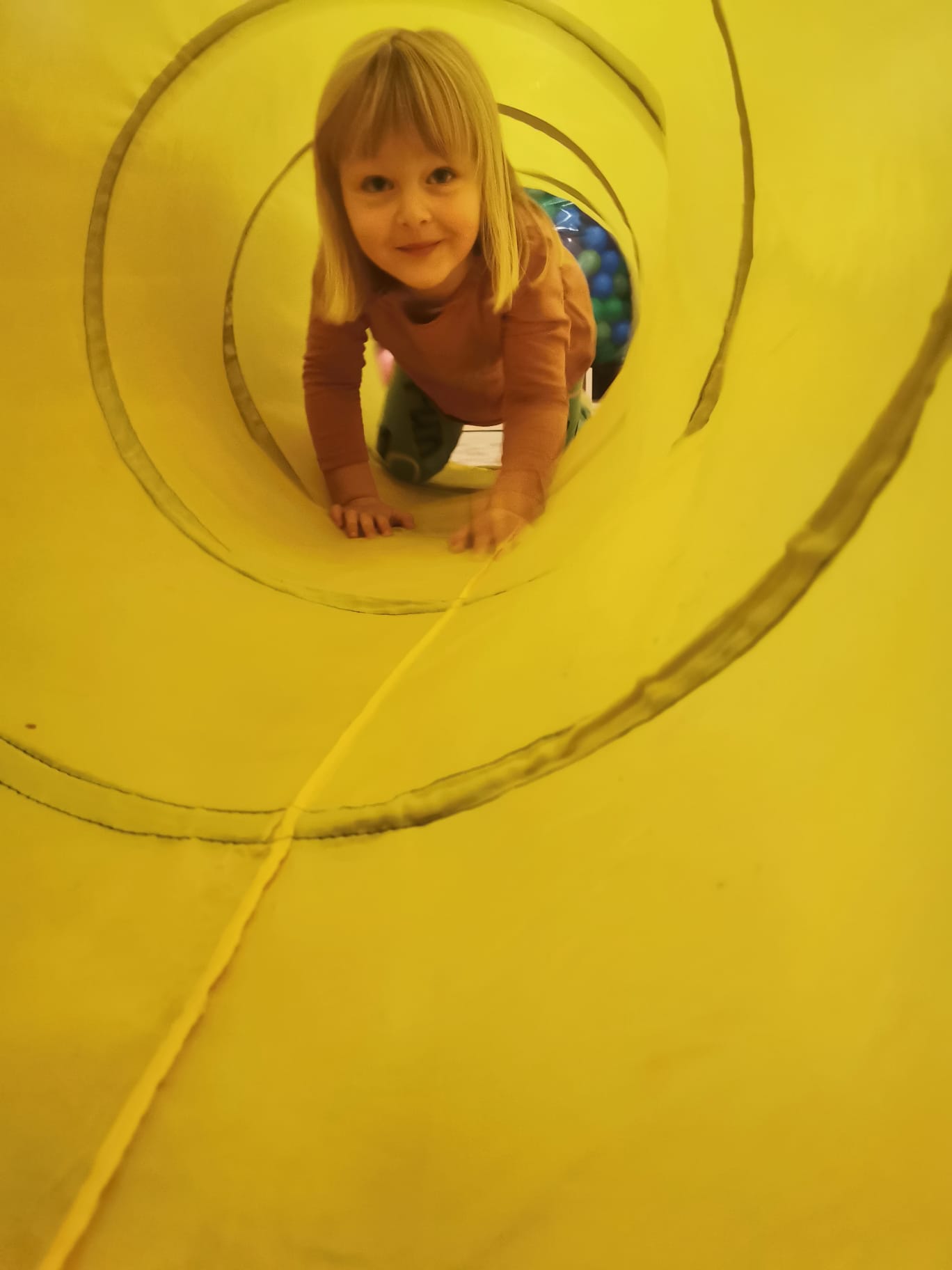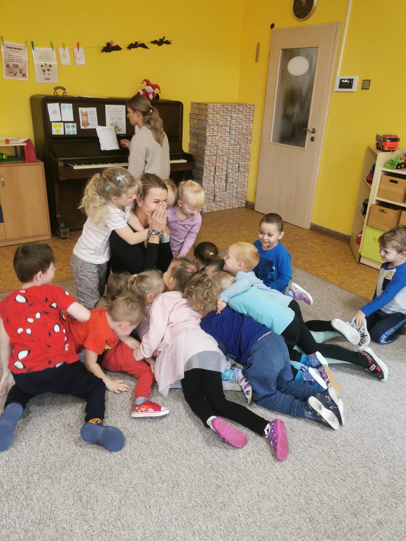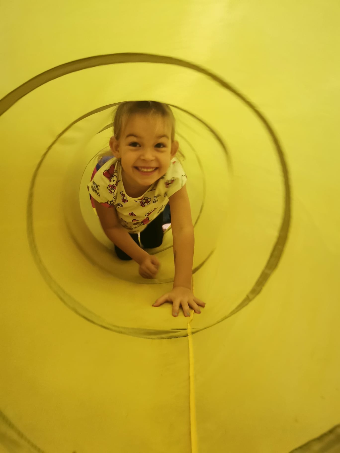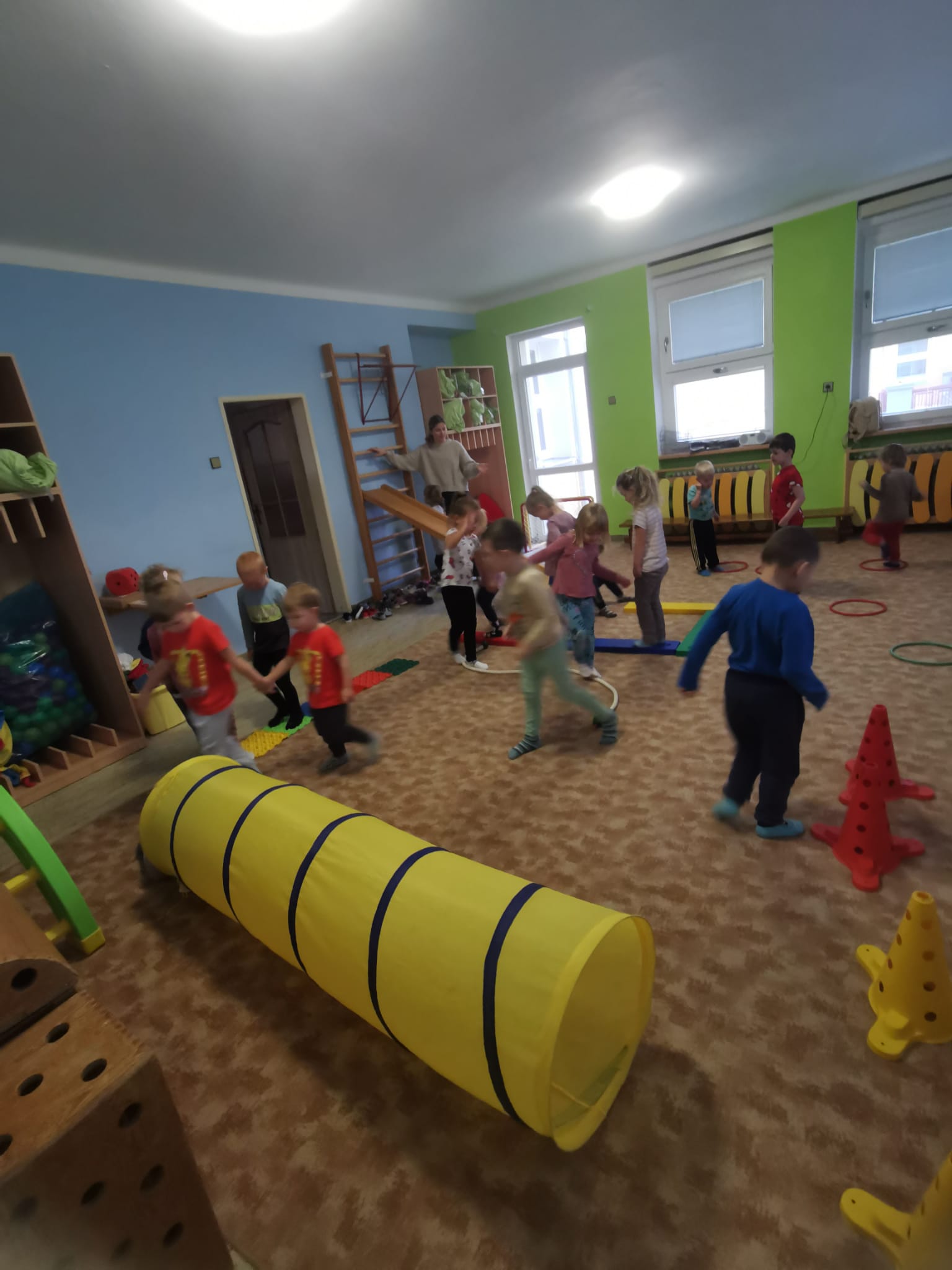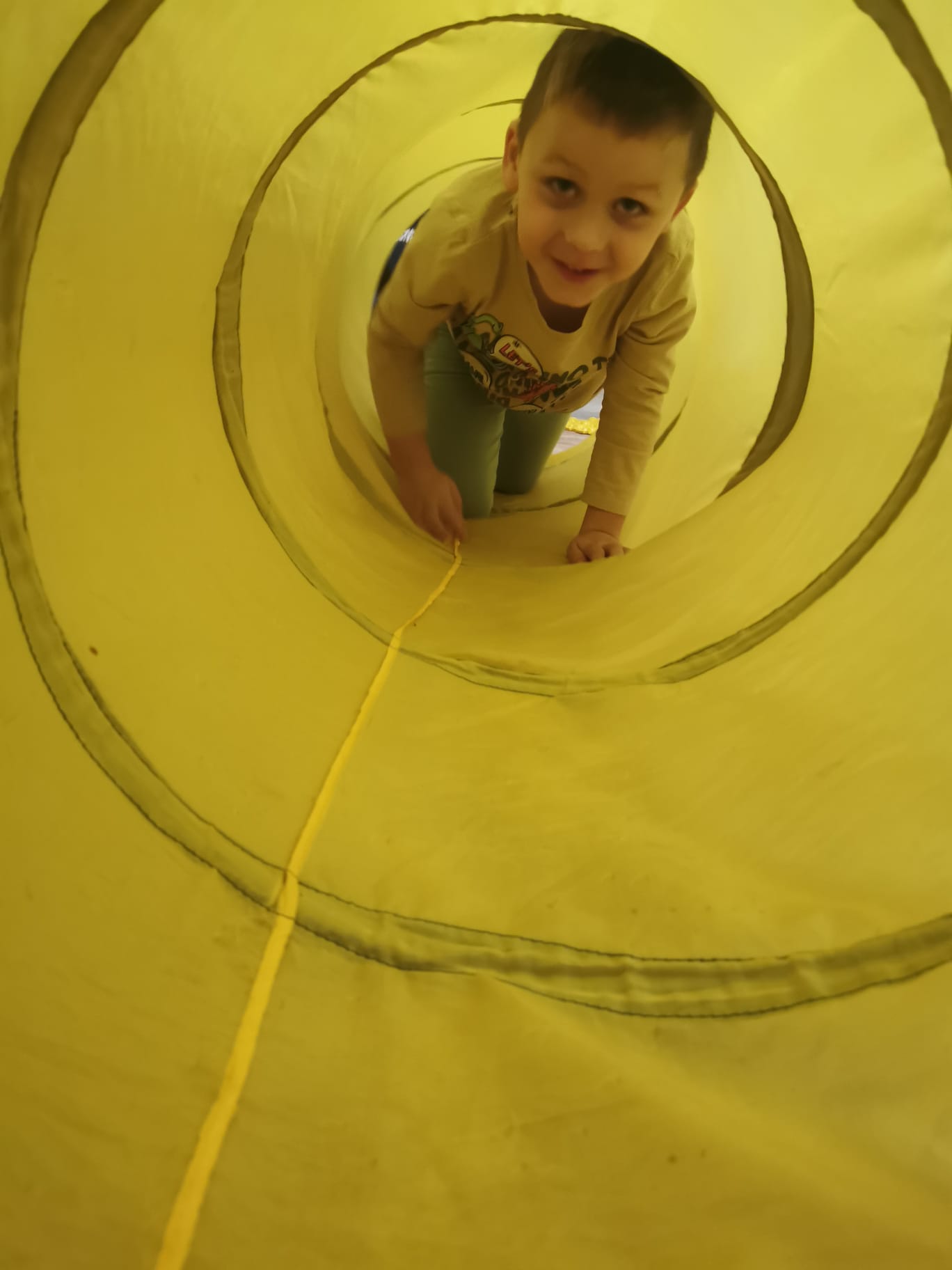 Cvičení- překážková dráha, chůze po laně a po destičkách, prolézání tunelem.