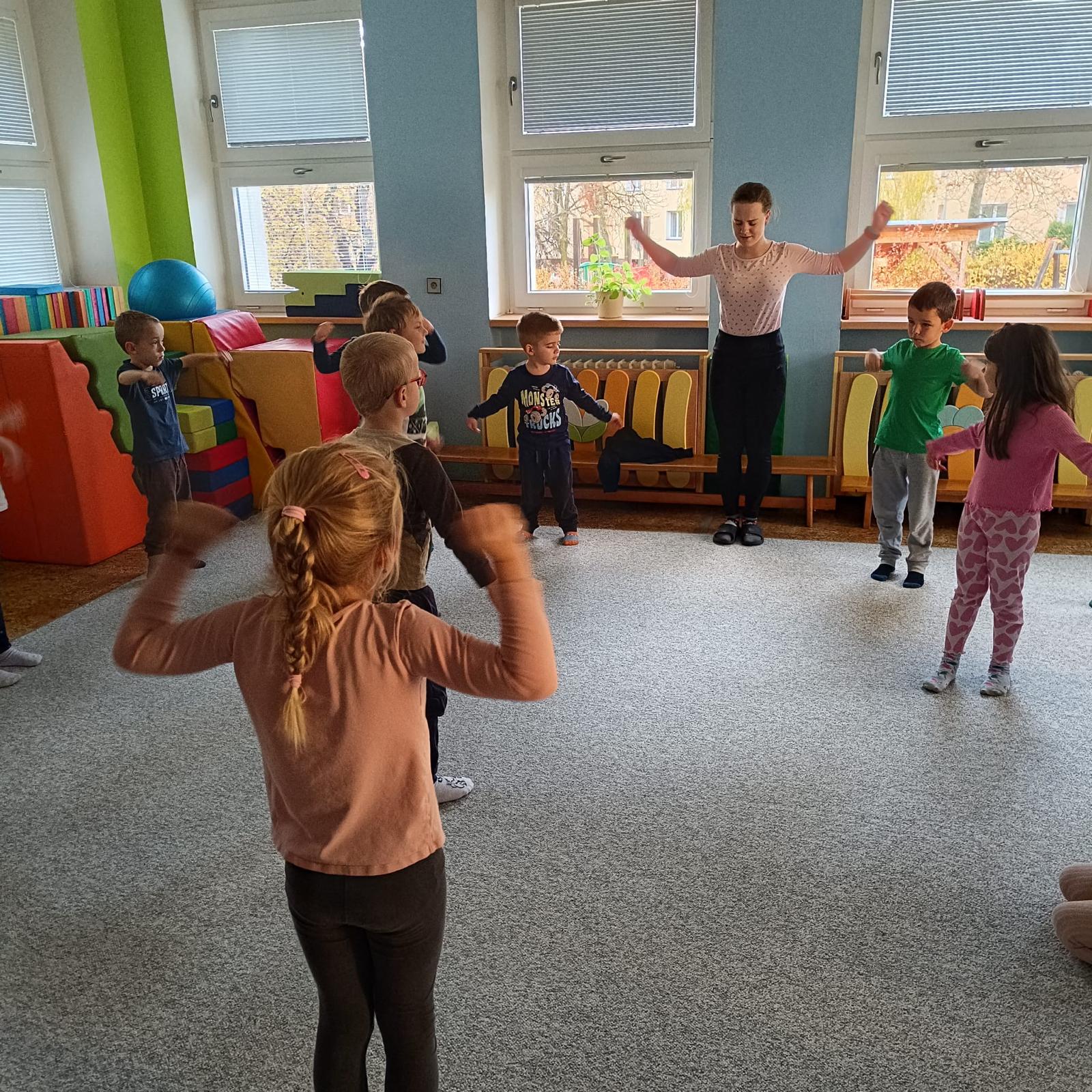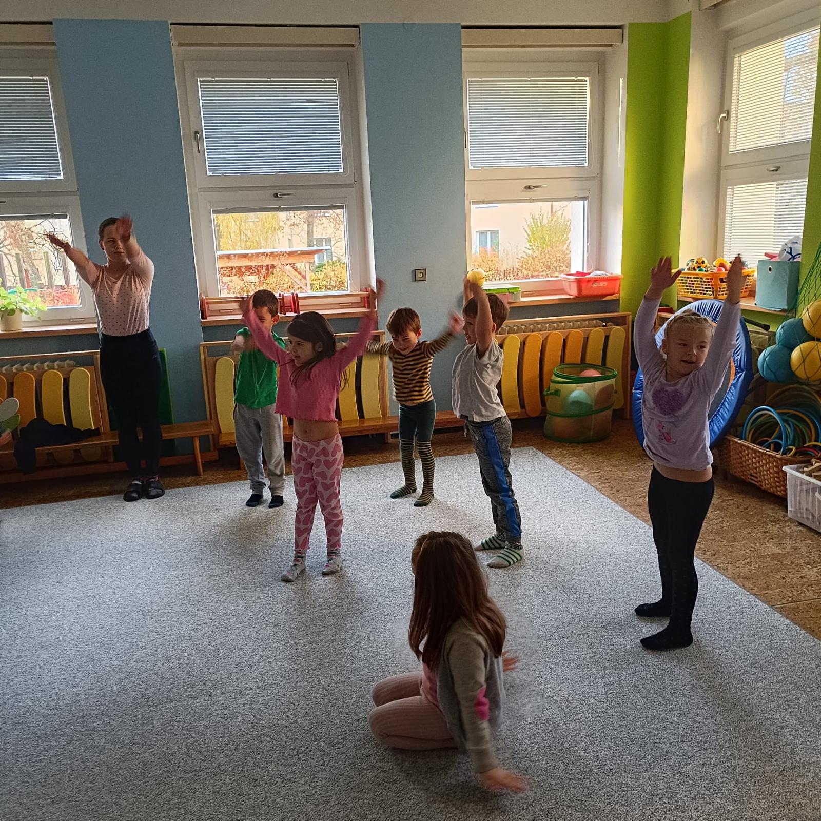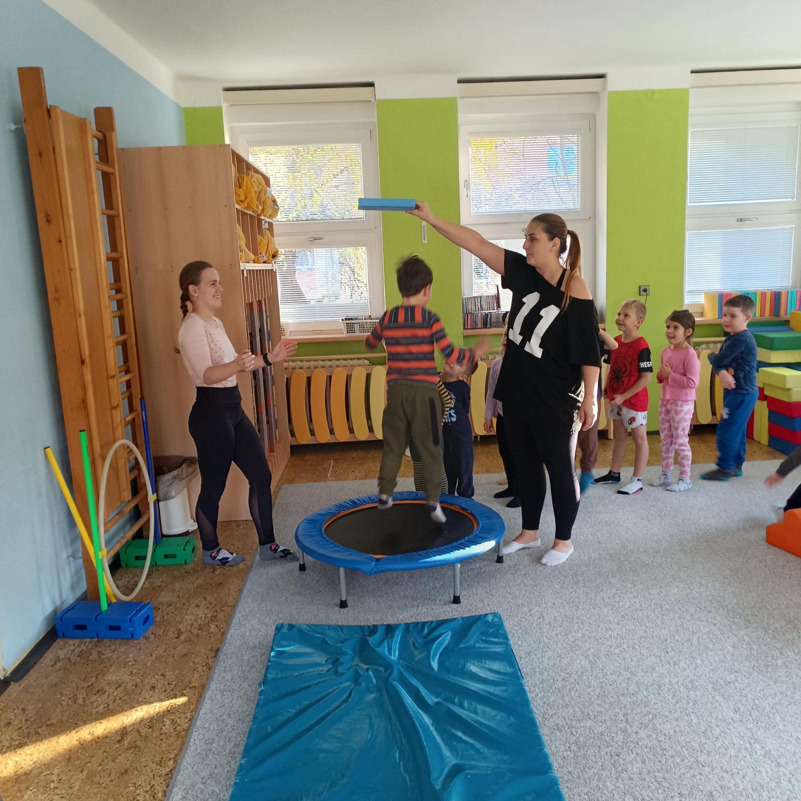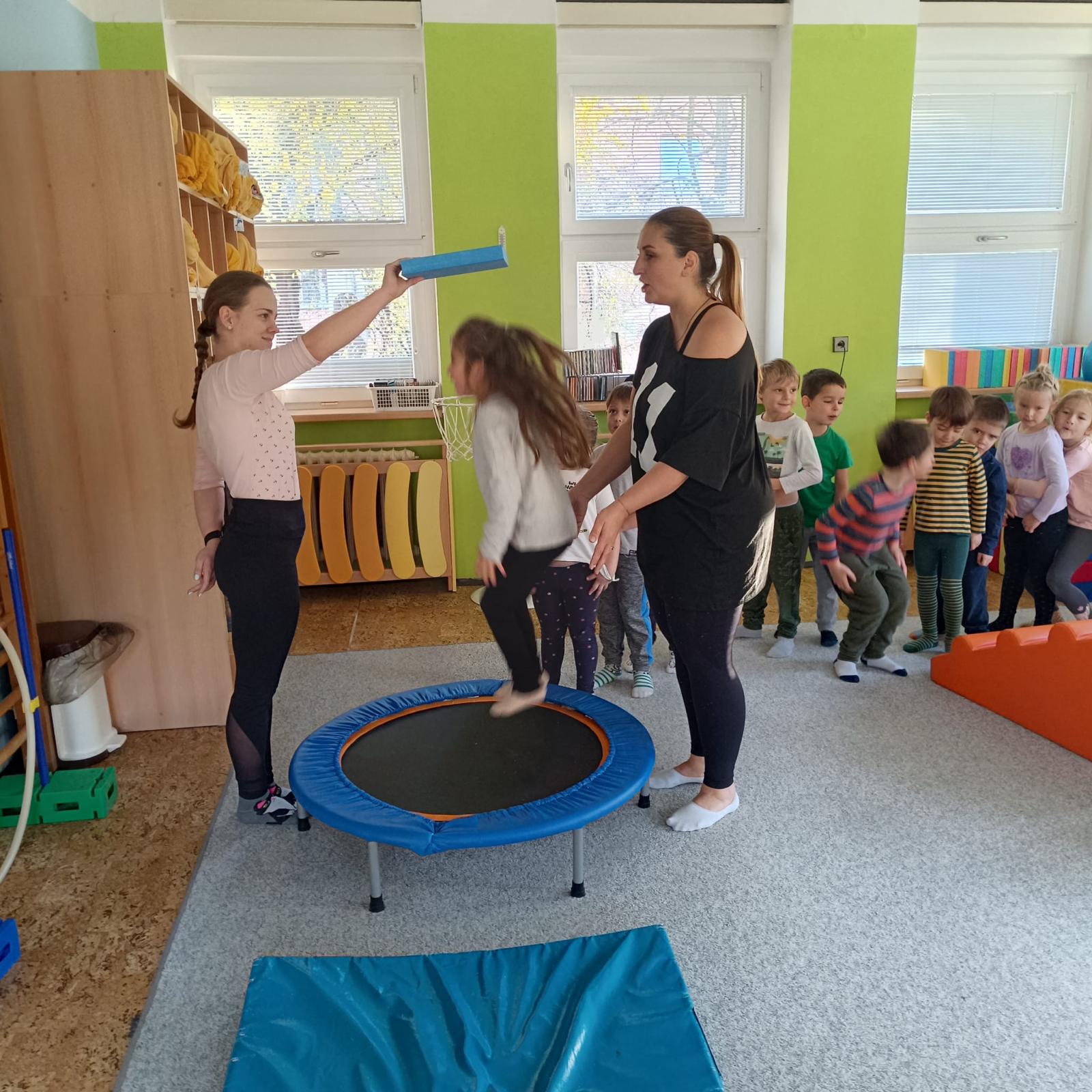 Páteční cvičení - trampolína, překážková dráha.