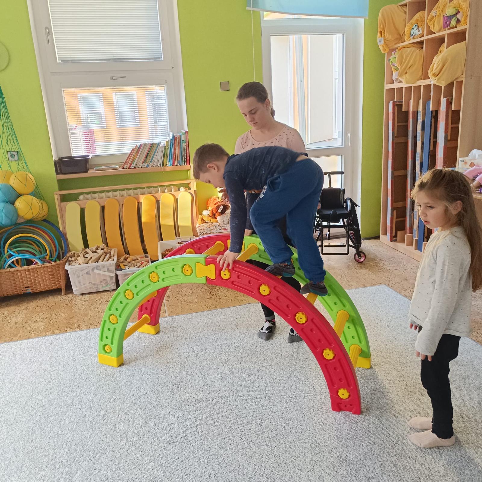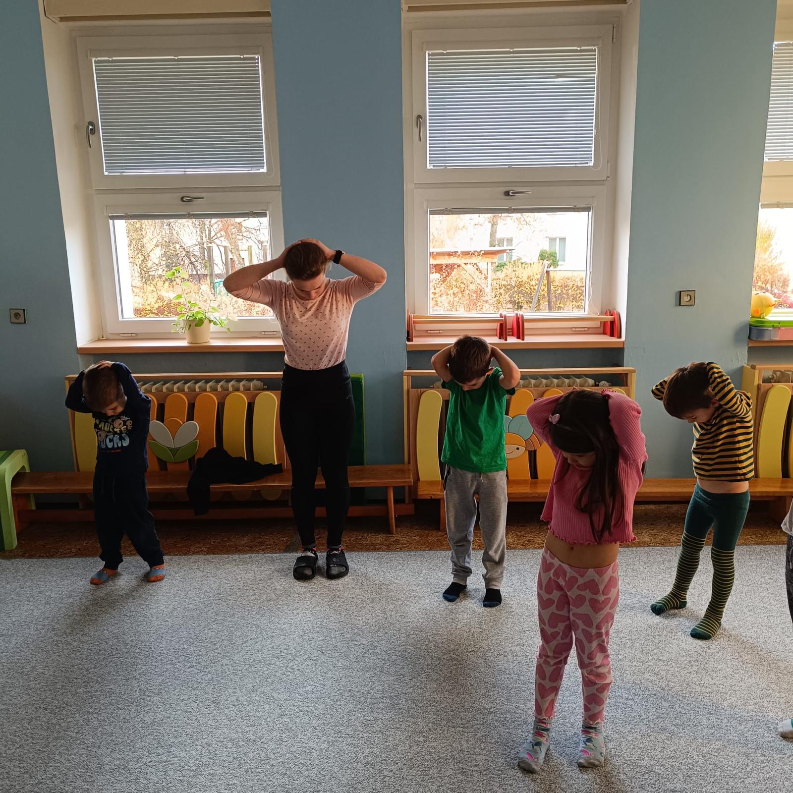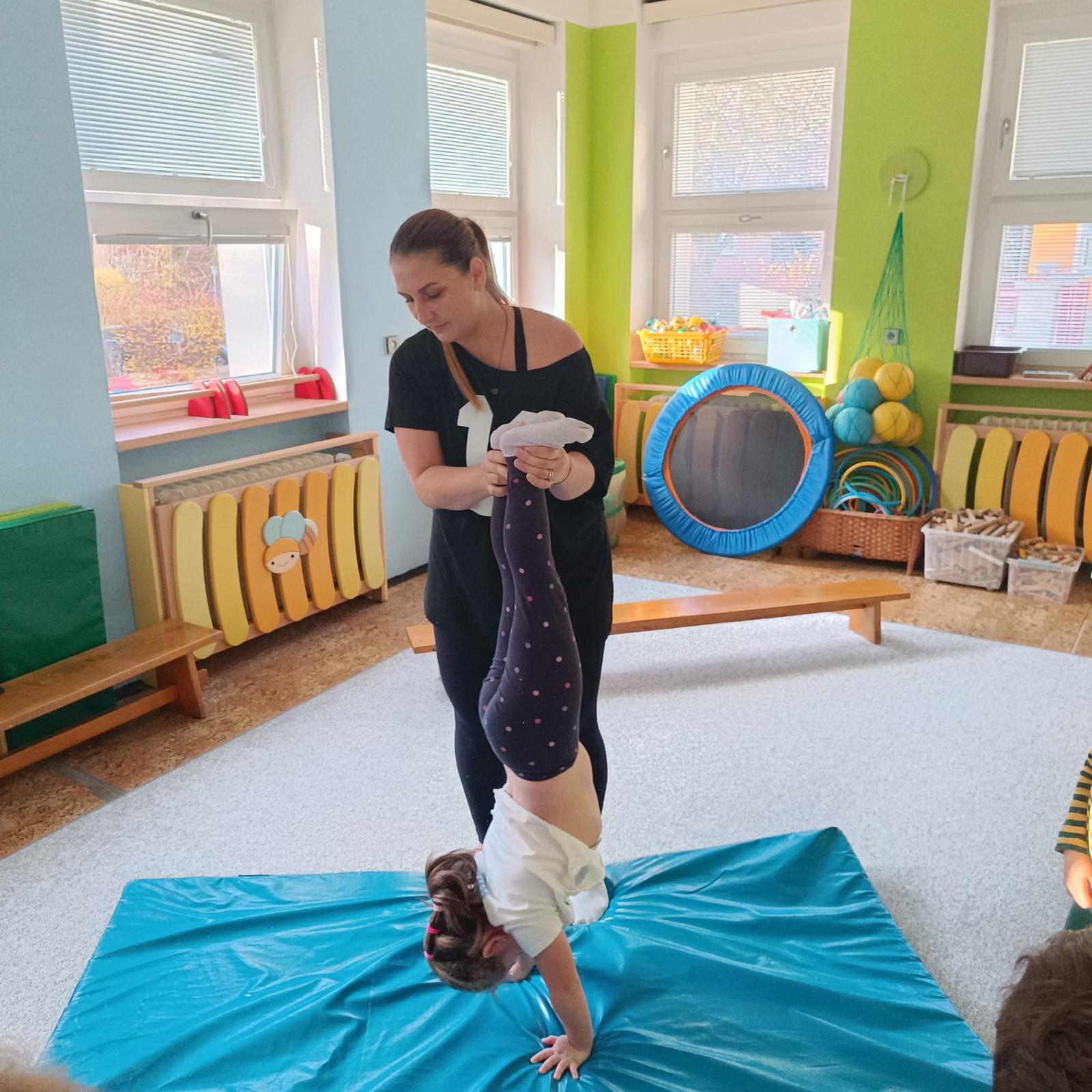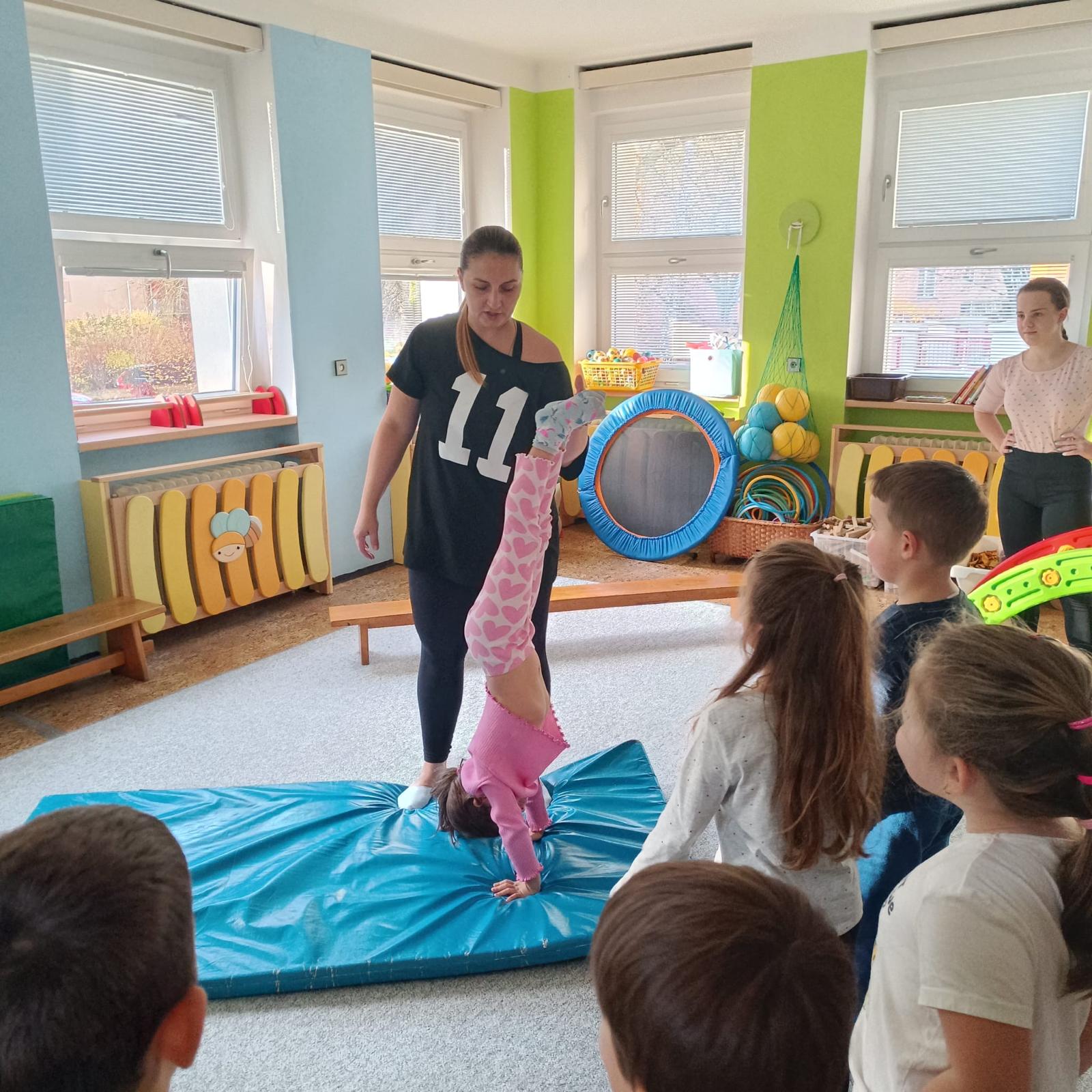 Páteční cvičení - trampolína, překážková dráha.