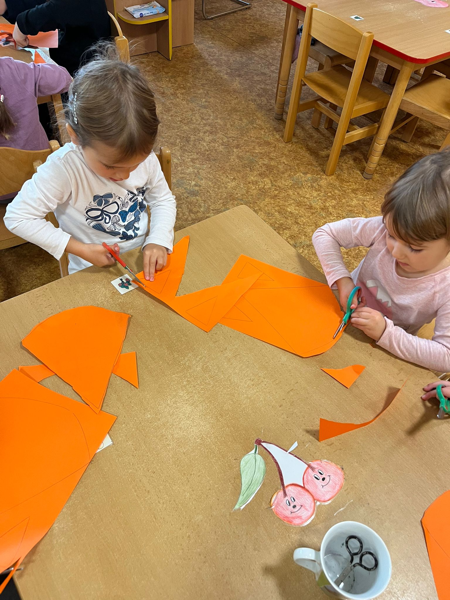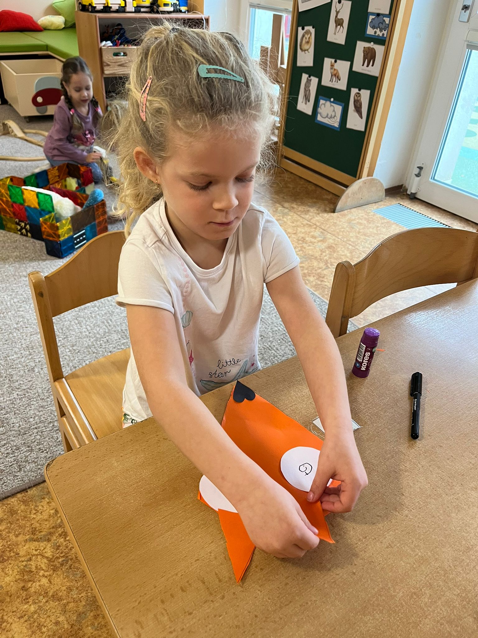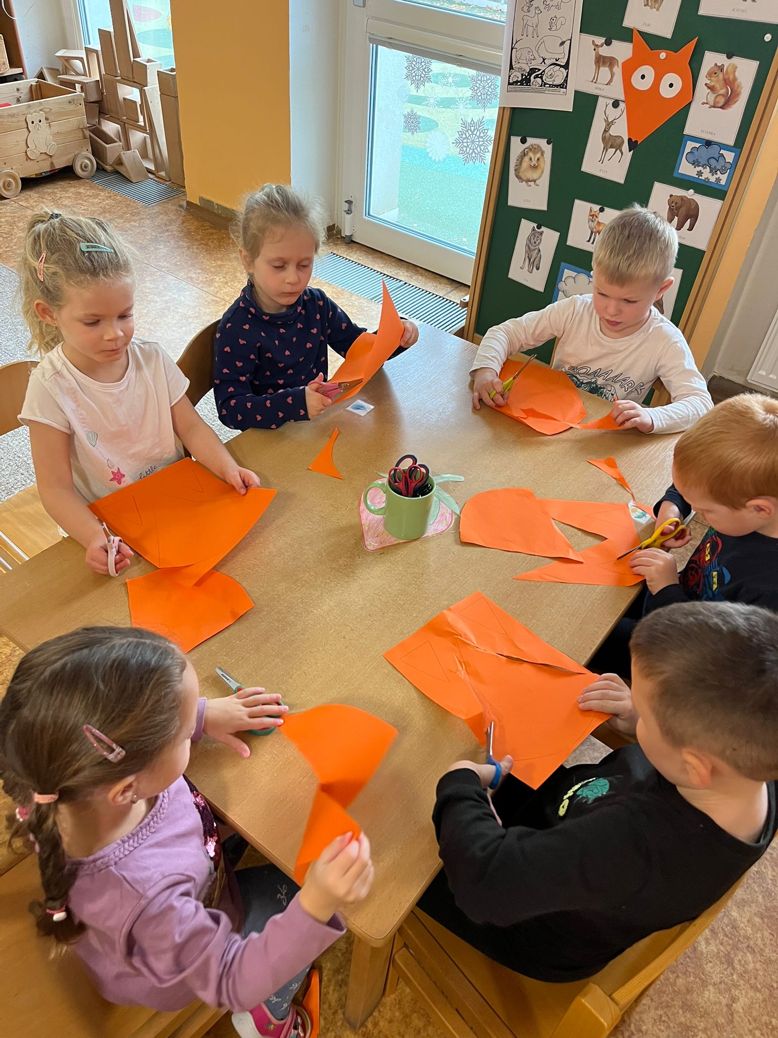 Tvoření lišky - práce s papírem, stříhání a lepení.