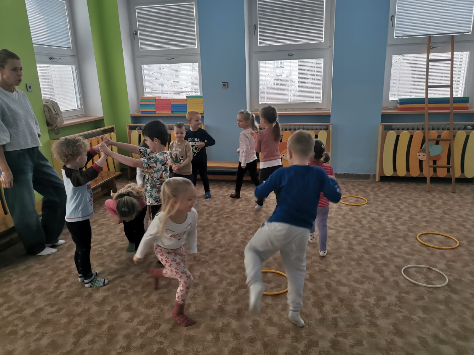 Nácvik nové pohybové hry Meluzína - cvičení s barevnými kruhy.